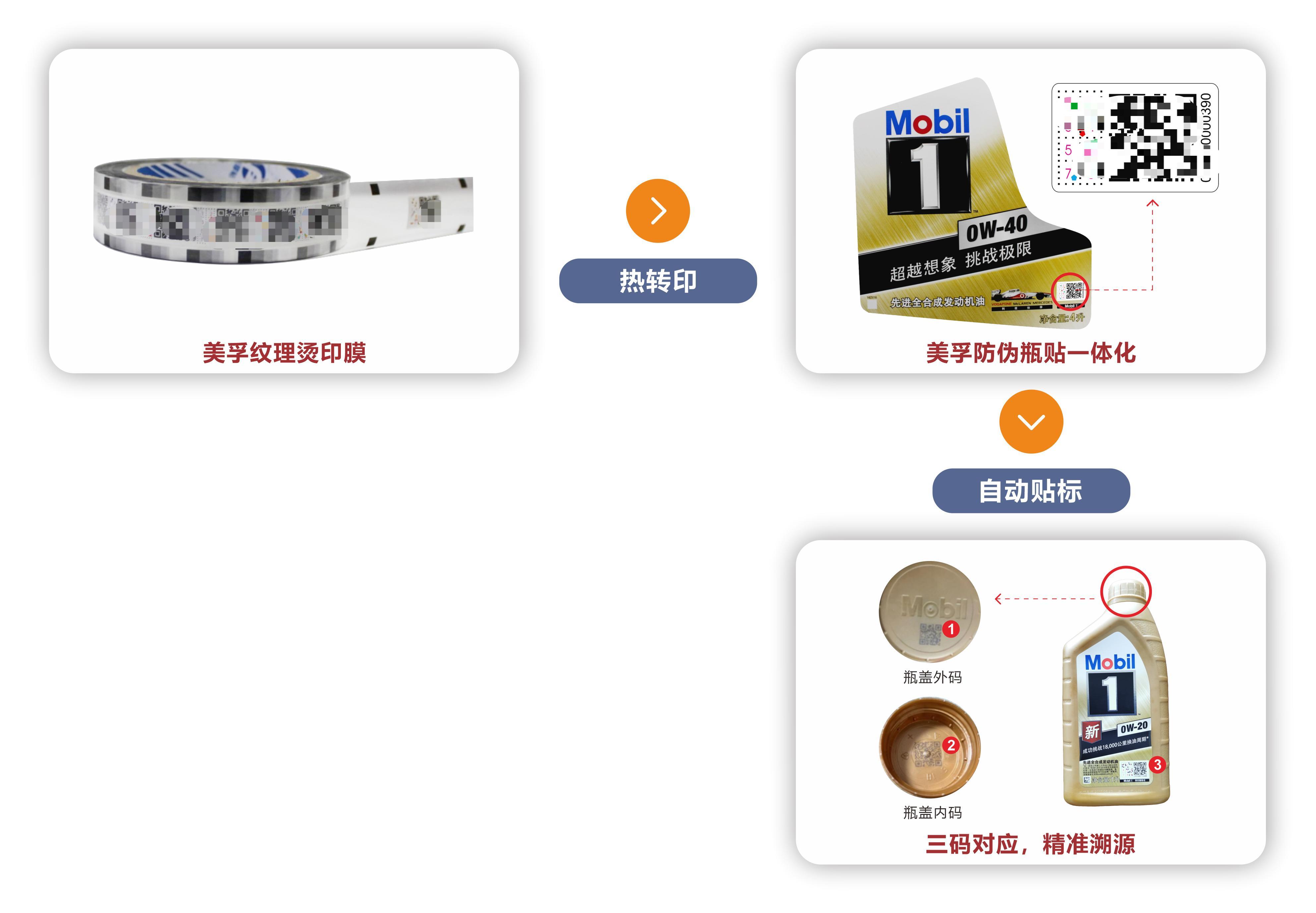 9. 拍拍看(海南)人工智能有限公司将“大尺寸纤维印刷”技术应用于美孚机油防伪标签,实现随机纹理特征+加密数字信息+多层对应关系+防伪标签与大标贴一体化多维度的防伪设计,有效打击了市场假冒乱象,产品销量显著提升,品牌保护取得成效。