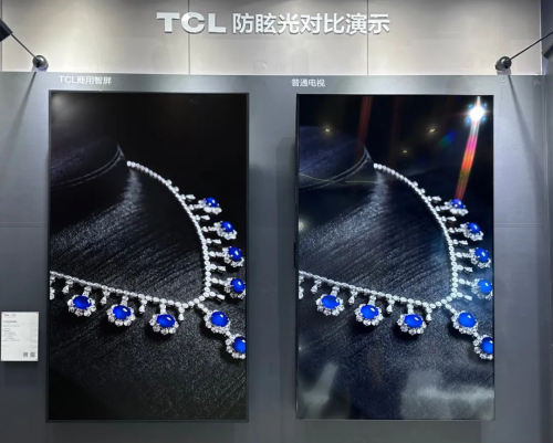在展会现场,TCL还特别进行了防眩光对比演示,直观呈现了TCL商用智屏与普通电视在显示效果方面的差异,获得现场观众和媒体一致好评。根据现场对比演示可见,TCL商用智屏在强光环境下的可视性表现突出,其防眩光技术可有效降低各类环境光干扰,确保商业信息在任何环境下都能清晰传达。