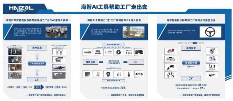 在平台赋能下,中小工厂正在突破行业与边界的限制。一家原本只生产煤气灶的小工厂,如今通过平台为海外柴油发动机客户供货;一家曾经做保温杯内胆的工厂,成功为航空航天领域提供高性能的储水设备内胆;一家过去只做外贸公司配套商的工厂,在平台帮助下,仅用4小时便成功对接杭州某创新企业。这些过去被局限在狭窄赛道的工厂,在海智在线的帮助下开阔了视野,走出了固有领域的桎梏,实现了企业的转型升级,创造了一个又一个蜕变的故事。