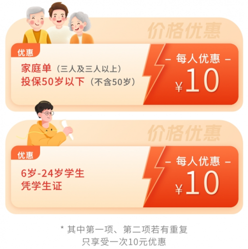 家庭单优惠:(三人及三人以上)投保50岁以下(不含50岁)参保用户每人优惠10元保费