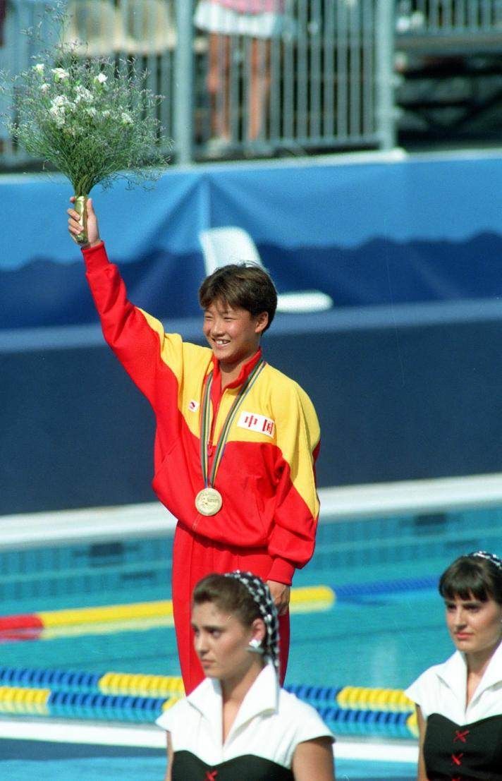 1992年巴塞罗那奥运会伏明霞身着“李宁”标志的领奖服