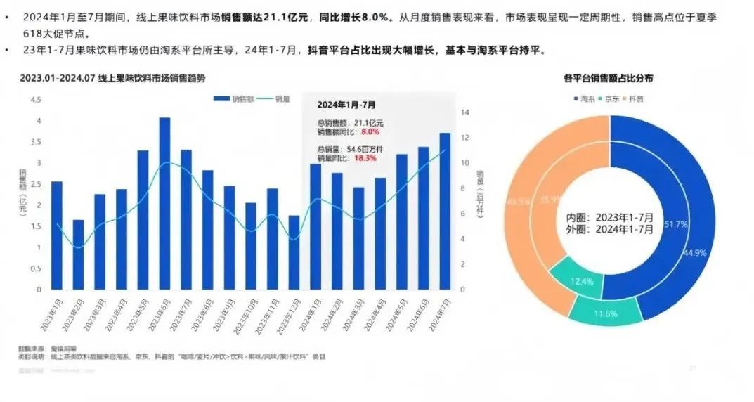 根据搜狐网2025年2月发布的《2024饮料市场趋势洞察》报告,线上果味饮料市场增长显著,销售同比增长8%。果汁品类向中高浓度、现制级口感迭代,消费者对“天然感”与“轻负担”诉求明确。减糖、无添加的果味饮品成为市场新宠,广泛适用于佐餐、聚会、轻运动等多种消费场景,夏季需求量尤为显著。