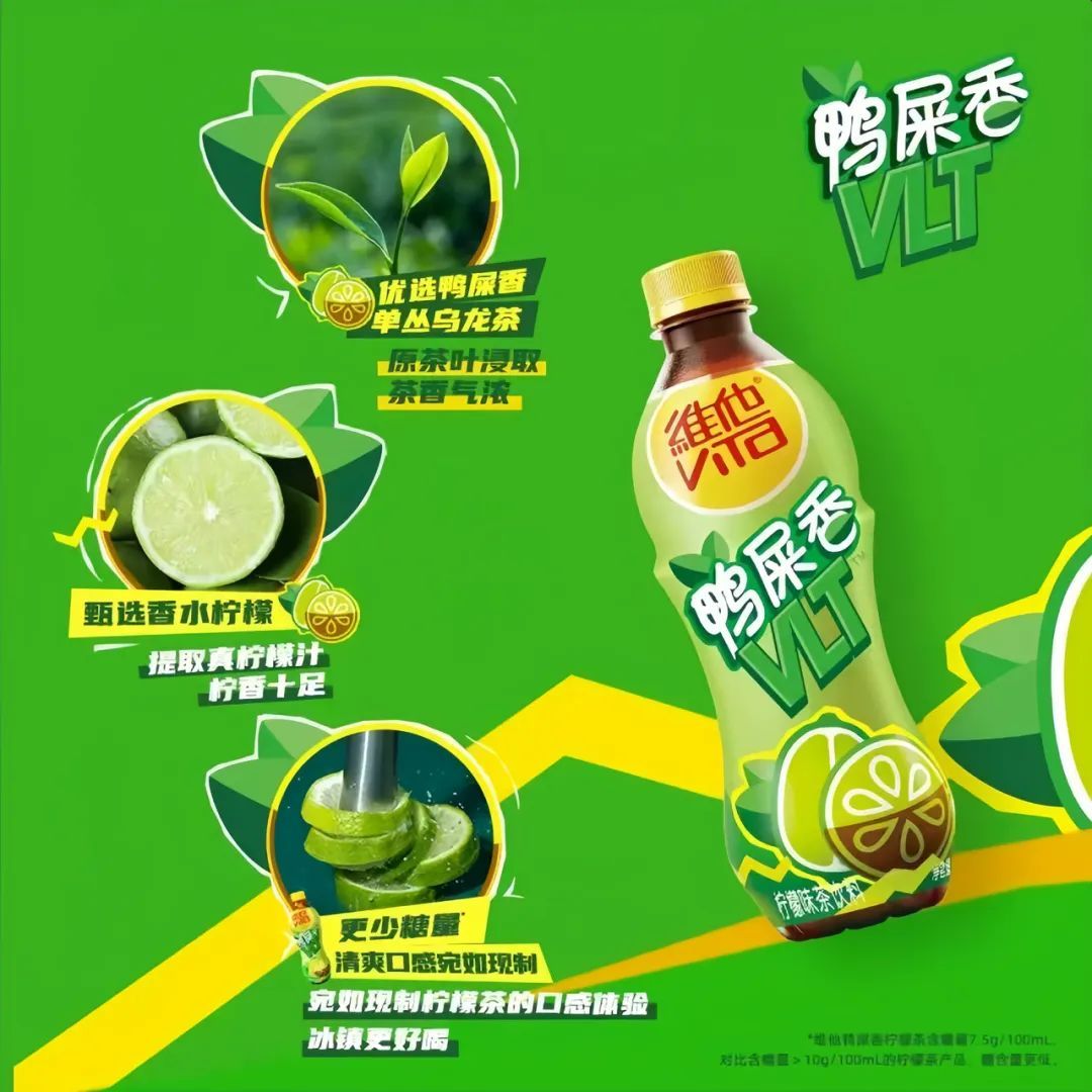 维他鸭屎香柠檬茶,将广式乌龙茶经典品种鸭屎香与香水柠檬完美融合,既保留文化底蕴,又增添风味层次。产品精准控制糖分,确保口感清新,减轻健康负担,符合消费者对低糖饮品的需求。绿色包装与“轻爽”理念相得益彰,视觉上强化产品特性。