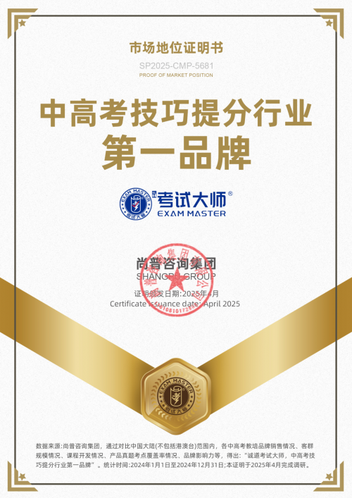尚普咨询作为中国市场调研和咨询行业领导品牌,其权威认证,为考试大师的行业地位注入强公信力。通过严谨的市场调研与国际化论证模型,证明考试大师因其优秀的品牌势能、卓越的产品竞争力、深度的服务能力、顶尖的产品研发能力等优势,深受用户市场欢迎,锚定其“第一品牌”地位。2024年数据显示,考试大师用户提分率高达90%,最高分突破703分,这些数字背后,是“让考试更简单,让人生更清晰”使命的具象化表达。