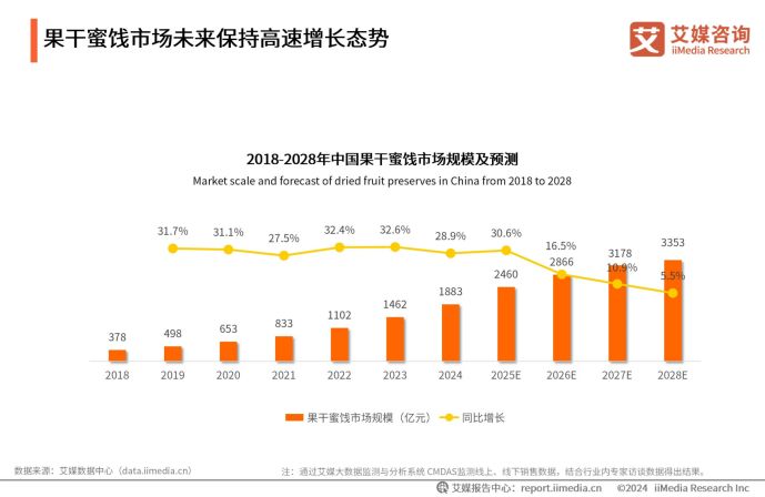 近年来,作为零食行业中的一匹“黑马”,冻干果蔬成为高增长品类。iiMedia Research(艾媒咨询)发布的《2024年中国果干蜜饯行业创新及消费者洞察报告》显示,2023年中国果干蜜饯产品市场规模达1462亿元,2019-2023年复合增长率达24.0%,预计2028年市场规模有望增至3353亿元。