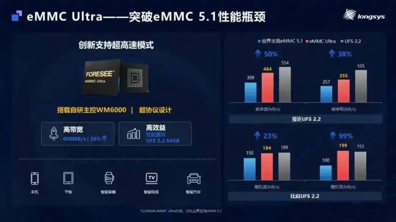 在智能手机市场,江波龙推出的eMMC Ultra产品,搭载了自研主控WM6000。这款芯片采用超协议设计,突破了eMMC 5.1标准,带宽提升50%,理论速度可达600MB/s,顺序读写性能接近UFS 2.2 64GB水平,随机读写性能与UFS 2.2 64GB水平相当,为智能手机等设备的流畅运行提供了有力保障。值得一提的是,江波龙荣登Aspencore 2025中国IC设计双榜,WM6000主控斩获“年度最佳存储器”荣誉,再次证明了江波龙在自研芯片上的不菲成绩。