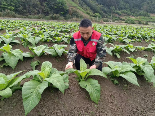 图为杨秀海深入烟田查看生态烟长势情况。黄文慧摄
