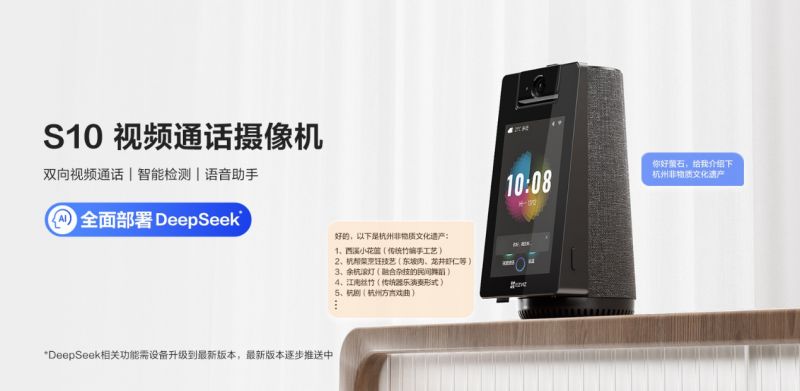 在AI智能看护层面,萤石 S10 搭载自研蓝海大模型,通过端云协同实现高精度跌倒检测、婴儿哭声识别、宠物活动监测等智能功能。一旦检测到异常,设备会第一时间向家庭成员推送 APP 预警,提供及时守护。萤石S10已在年初率先接入并完成 DeepSeek 模型部署,用户无需任何设置,只需通过内置语音助手即可发起深度对话,获取天气查询、油价查询等服务。作为智能家居生态的一环,S10还支持联动萤石全屋智能设备,实现语音控制灯光、窗帘,以及远程开锁等功能。