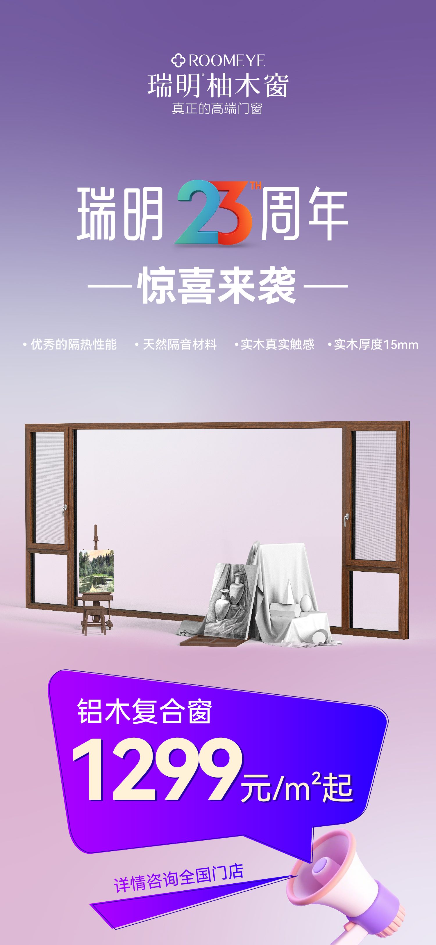 值此瑞明23周年庆之际,推出爆款铝木复合窗纱一体窗,1299 元 /㎡起!全国国补福利重重叠加,以铝合金窗的价格,畅享品质铝木空间!