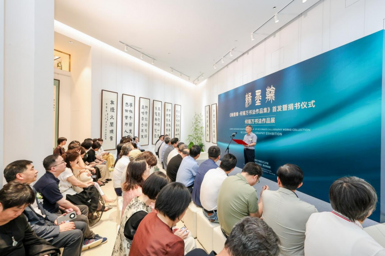 2025年5月20日,中国宁波。初夏的江南,微风轻拂。在宁波市鄞州区中塘河与前塘河的交汇处,绿树掩映下的何锡万书画艺术工作室一改往日的宁静,只见人头攒动,显得格外热闹。原来,何锡万书法作品集首发暨何锡万书法作品展活动在这里举行。此刻,高朋满座,云集了诸多书法界人士和业内大咖,并吸引了一大批书法爱好者和市民驻足浏览参观。