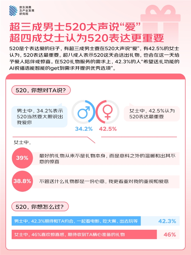 -今年520,有超三成男士要大声说“爱”,有42.5%的女士认为,520表达最重要。超八成人表示520这天会送出礼物,也会在这一天给予爱人陪伴或惊喜。