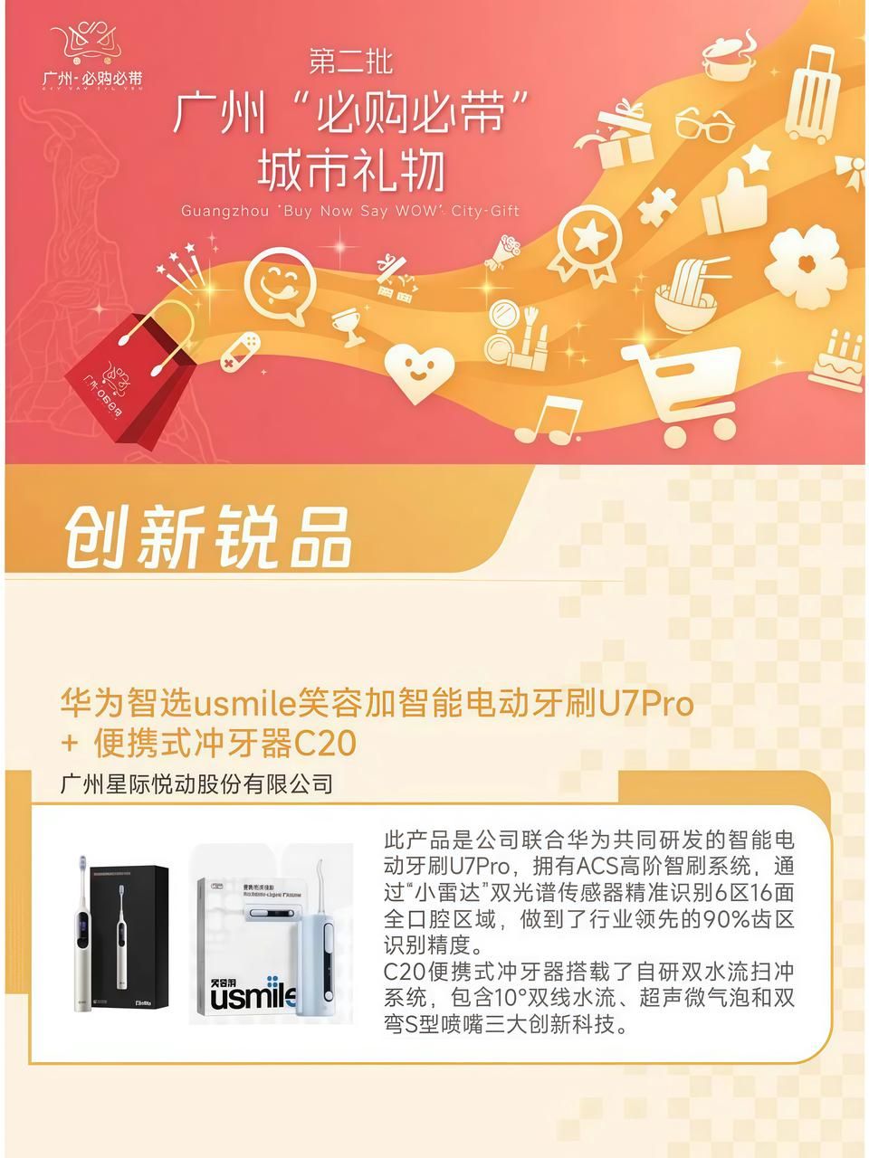 广州市商务局近期组织开展了第二批广州“必购必带”城市礼物评选活动,本土口腔健康品牌usmile笑容加的两款产品——智能电动牙刷U7 Pro与冲牙器C20脱颖而出,成为代表广州智造实力的新名片。这两款产品凭借前沿技术、卓越性能与人性化设计,不仅在国内市场掀起消费热潮,更成为海内外游客来穗必购的“健康科技伴手礼”。