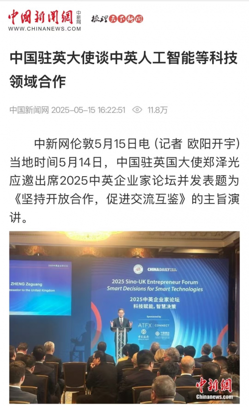 中国驻英国大使郑泽光出席论坛并发表题为《坚持开放合作,促进交流互鉴》的主旨演讲。他强调了国际合作对于人工智能发展的重要性,呼吁共同构建开放包容的市场发展环境。英国48家集团主席杰克·佩里则指出英国应在吸引人工智能投资方面提供互补价值,并积极评价了中国在全球舞台上的角色。
