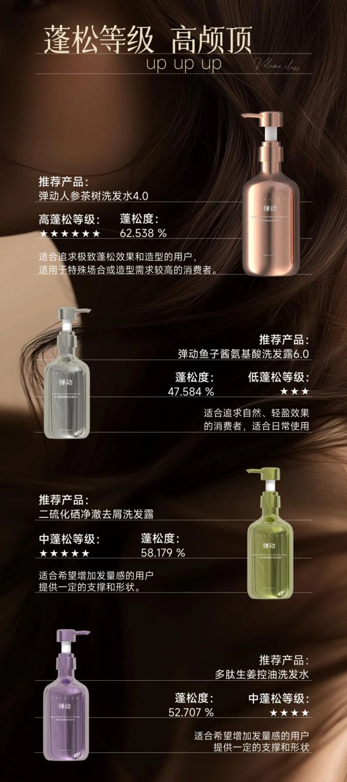 传统的洗护市场,“蓬松”表述模糊,消费者常需反复试错。而弹动品牌通过发束体积测量法与消费者盲测评分,将旗下不同产品的蓬松效果量化为“低、中、高”三个level,还明确蓬松度提升的具体数值,让消费者能根据自己发质情况精准匹配洗发水。