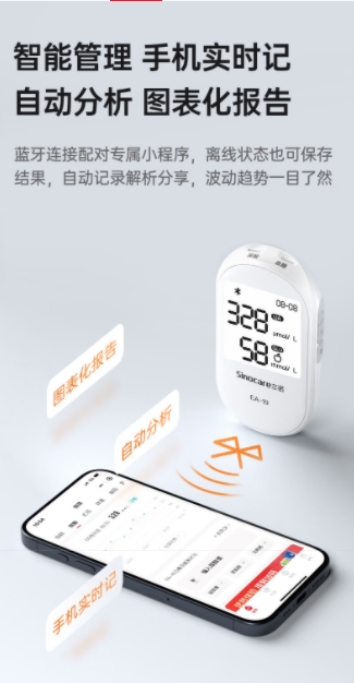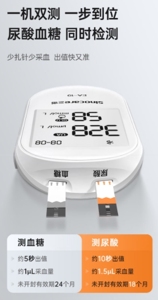 此外,三诺 EA-19 尿酸仪的多功能一体化设计,更是贴合现代人的健康管理需求。它支持尿酸、血糖双项检测,仅需一滴血,5 秒就能测出血糖值,10 秒获取尿酸结果。聚餐后用它简单一测,既能了解尿酸情况,又能掌握血糖数据,一次检测解决两个健康监测需求,高效又省心。
