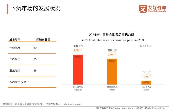 近年来,中国消费市场呈现显著“下沉”趋势,县域消费活力持续向上。数据显示,2024年城镇消费品零售额为421166亿元,同比增长3.4%;乡村消费品零售额66729亿元,同比增长4.3%,乡村市场销售增速持续高于城镇。艾媒咨询分析师认为,乡村市场销售增速持续高于城镇,显示出乡村消费市场更好的潜力和发展动力。这一趋势与下沉市场商业体系建设的持续推进密切相关,随着下沉市场商业体系的不断完善,县乡消费市场的发展步伐加快,市场占比稳步提升。