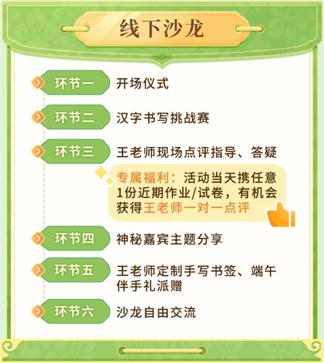 现场互动设置了“汉字书写挑战” 环节,王慧志老师将引导学员将通过拆字谜题,在破解过程中深入理解汉字的构字逻辑,感受偏旁部首组合的奇妙规律。而端午诗词书写秀环节,则将书法与传统文化巧妙结合,孩子们将在古风背景音乐中挥毫写下 “端午临中夏,时清日复长”“轻汗微微透碧纨,明朝端午浴芳兰” 等经典诗句,不仅提升孩子们的书写能力,更能在墨香中体会诗词的意境之美。