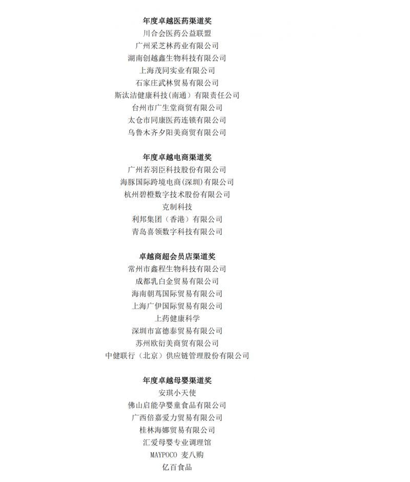 历时一个月面向全行业公开征集申报资料,依据综合评审体系,由专委会评审打分评选出年度十大创新产品、年度影响力品牌、年度人气品牌、年度卓越医药渠道、年度卓越电商渠道、卓越商超会员店渠道、年度卓越私域渠道、年度卓越母婴渠道,并首次设置人物奖项:风云企业家、青年研发人物,十大奖项已于当晚全部揭晓!