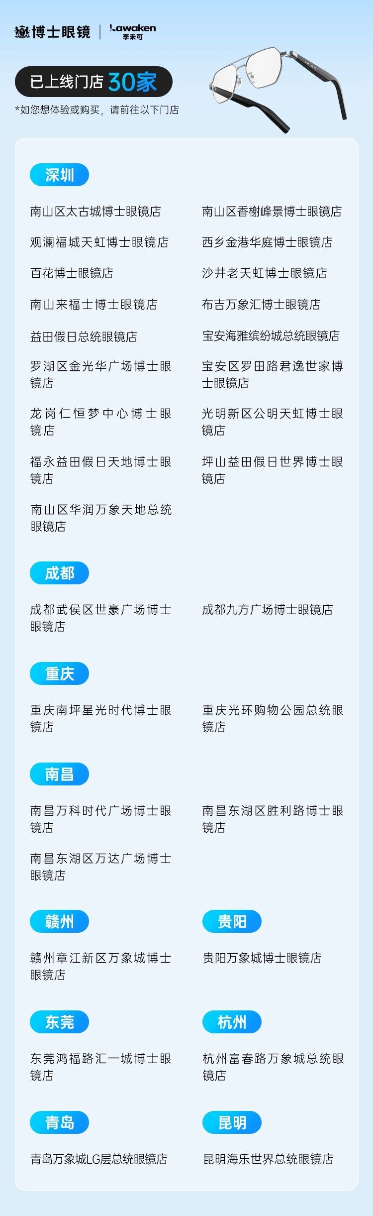此外,李未可科技同步宣布与博士眼镜达成战略合作,目前AI智能眼镜City 正式进驻其全国30家线下门店,方便用户到线下体验购买,并提供专业验光与场景化体验服务。