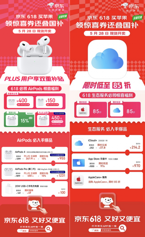 来了!“又好又便宜”的京东618将于5月30日晚8点正式开启。更加惊喜的是,这一重磅补贴政策将提前引爆,在5月28日晚8点开启的“京东超级补贴日”就将上线,率先放价。其中,Apple产品京东自营旗舰店每晚8点限时领1200元以旧换新券,还可享受国家补贴立减500元、苹果惊喜券等优惠。值得一提的是,购买指定iPhone还可领取陕西消费券,全国消费者可领可用,至高减400元,iPad Pro、Mac以及6000元以上iPhone可用。此外,iPad、Mac、Apple Watch、AirPods等热门产品均有惊喜超值价,打开京东搜索“苹果惊喜券”,一键直达活动页面。