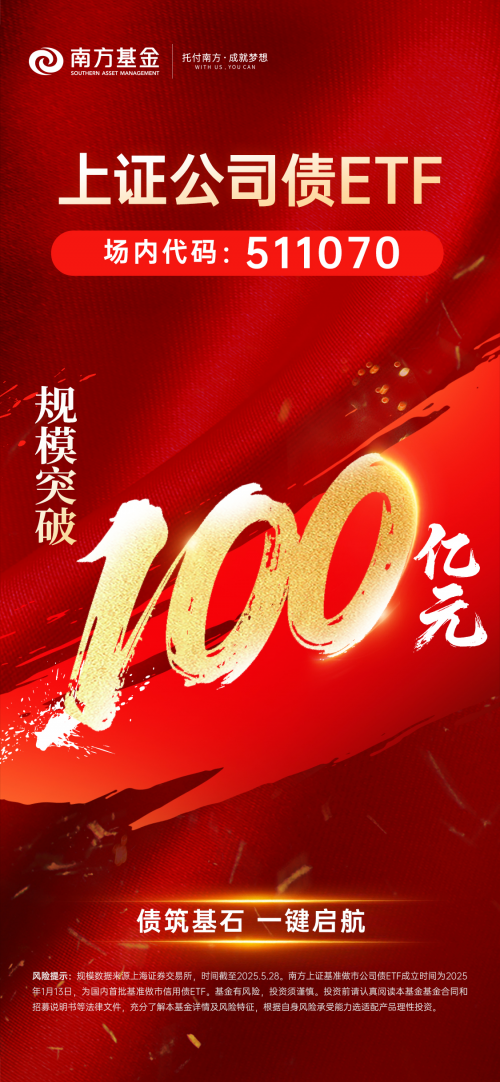 上交所数据显示,5月28日,南方基金旗下上证公司债ETF(基金代码:511070)规模突破100亿元,成为信用债ETF市场的重要标杆。这一里程碑式的突破,不仅彰显了市场对该产品的广泛认可,也为投资者提供了更为丰富多元的资产配置选择。