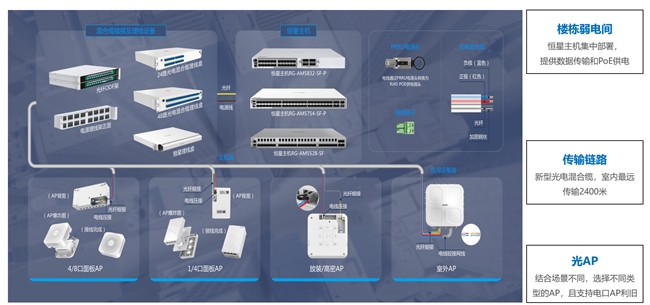 构建敏捷灵活的业务扩展:聚焦企业办公、制造、仓储等多元场景,以太彩光4.0支持Wi-Fi 7一纤通达与2.5G/10G平滑升级,无需重新布线,弱电间无源设计可将桌面可用带宽提升24倍。面向不同空间形态,支持多种类型AP接入,并兼容原有电口AP利旧,部署更加灵活、成本更加可控,实现业务扩容效率提升50%以上。