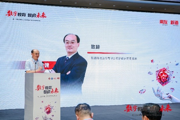 新道科技股份有限公司新道研究院院长宋健为本次大会致辞。宋院长指出在当前信息技术突猛进、产业人才数智化转型的关键时期,更要重视基础人才的培养,从文化基础、技术基础、专业实践基础、职业素养基础等方面落实到位,夯实专业基础,探索建立"技术赋能,育人为本"的职教新路。