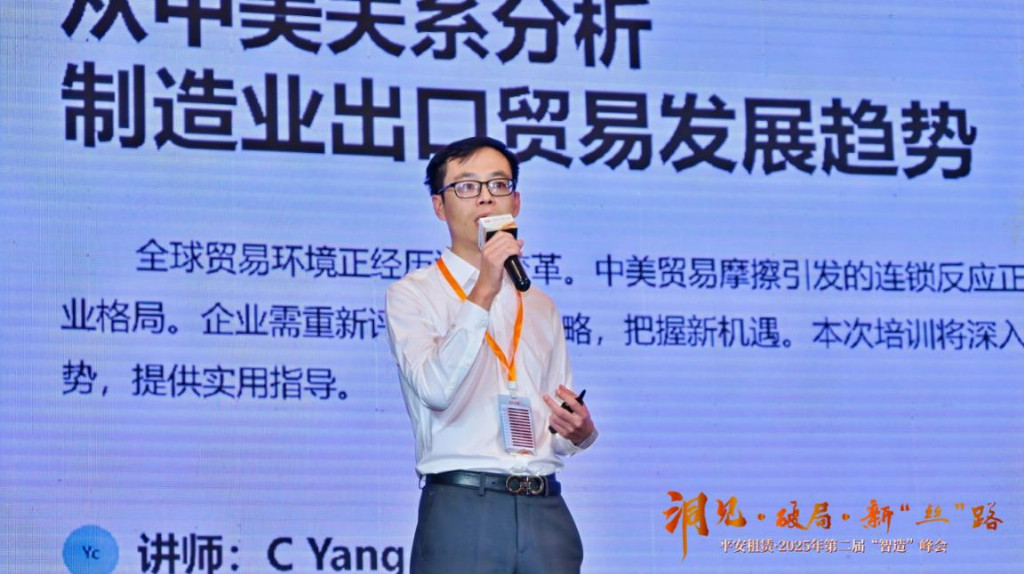 在《从中美关系分析制造业出口贸易发展趋势》主题分享环节,越南茂硕电子有限公司总经理杨超从中美关系下全球贸易格局、中国制造业转型挑战、国际化破局策略及海外管理实务四个维度,系统阐述了全球变局下中国制造业出口的突围路径,强调主动国际化与科学布局是应对关键。