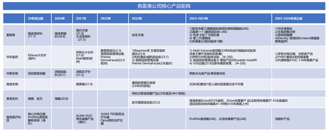 上游厂商都在打造完整的产品矩阵,未来需要关注产品矩阵丰富度和竞争力。22-23年大单品上新有限,多为光电类仪器,华东利拉鲁肽作为国内首个减肥适应症GLP-1产品受关注。2024-25年多款新品有望贡献增量,如爱美客-肉毒素、华东医药-玻尿酸/再生产品伊妍仕M型、昊海生科第四代有机交联玻尿酸、复锐医疗科技-长效肉毒/玻尿酸等。