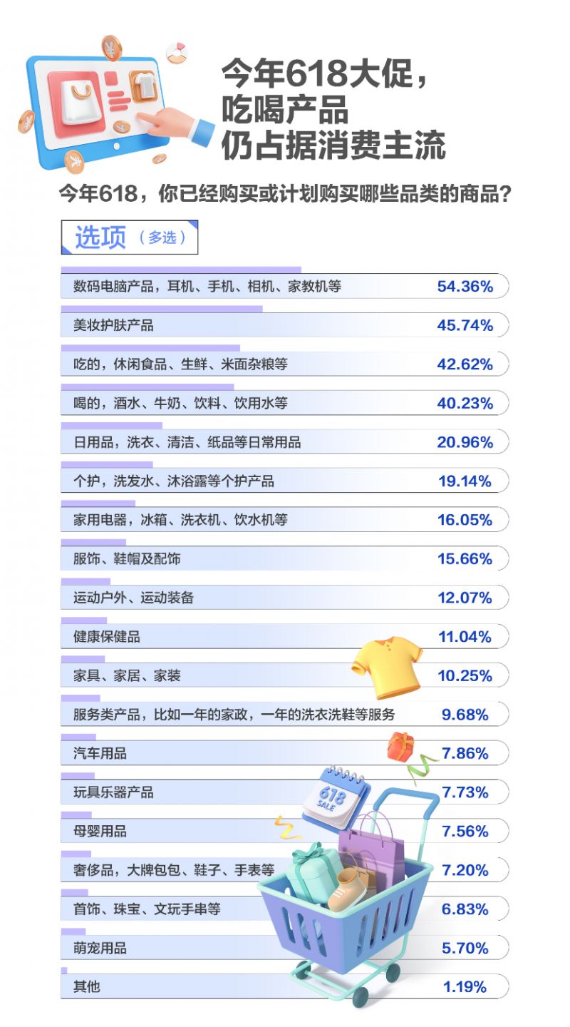 在一系列提振消费政策推动下,今年以来我国消费市场整体呈现出稳步回升的势头。调研显示,在今年“618”大促中,除了数码电脑、美妆护肤产品外,吃喝产品仍牢牢占据消费者购物车的C位。其中,42.6%的消费者购买了休闲食品、生鲜、米面杂粮等“吃”的产品,40.2%的消费者购入了酒水、牛奶、饮料等“喝”的产品。