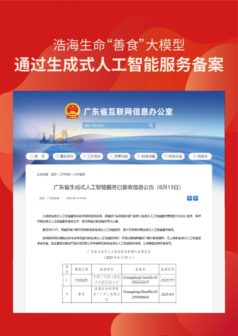 2025 年 6 月 13 日,广东省互联网信息办公室发布《广东省生成式人工智能服务已备案信息公告》,浩海医疗(华美浩联集团公司)旗下子公司浩海生命科学技术(广州)有限公司(简称 “浩海生命”)自主研发的 “善食” 大模型荣耀入列,标志其技术合规性获官方认可。