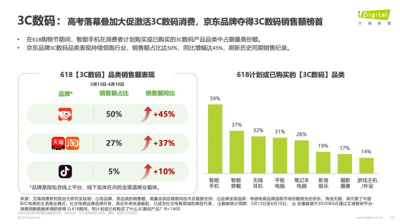 3C数码和家用电器等带电品类是618大促的“重头戏”,京东在该领域卓越表现,持续巩固行业领先地位,销售占比及增速均位列第一,优势进一步扩大。