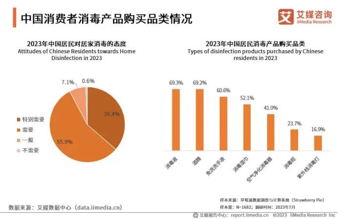 近年来,随着人们对卫生防护意识的不断提高,消毒杀菌产品市场迎来了前所未有的发展机遇。消费者对于个人健康和卫生的关注度持续攀升,推动了消毒杀菌产品需求的快速增长。iiMedia Research(艾媒咨询)调研数据显示,超九成的中国居民认为仍然需要居家消毒,仅有0.6%的中国居民认为不需要进行居家消毒。在中国居民购买的消毒产品中,消毒湿巾因便携等特点进入TOP5。