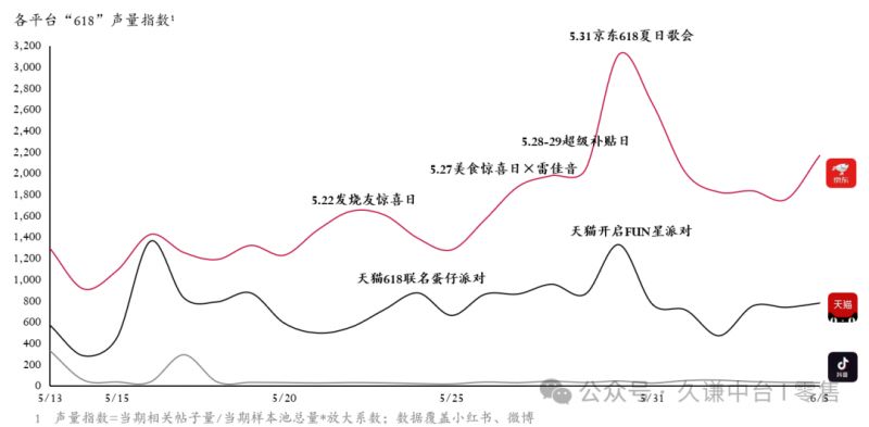 据久谦中台数据,在社媒声量(覆盖小红书、微博)方面,京东凭借其高频次、高创意的营销活动实现了全平台领先,消费者感知度显著提升。这为其后续的销售爆发奠定了坚实的流量基础。