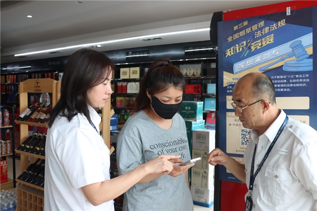 图为赵中华(右一)、赵研(左一)宣传烟草专卖法律法规