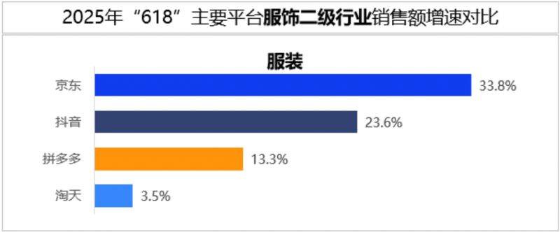618期间,京东在服饰品类以26.5%的同比增速领跑行业,在二级行业中的服装行业实现33.8%的强势增长,增速领先第二名超10个百分点。