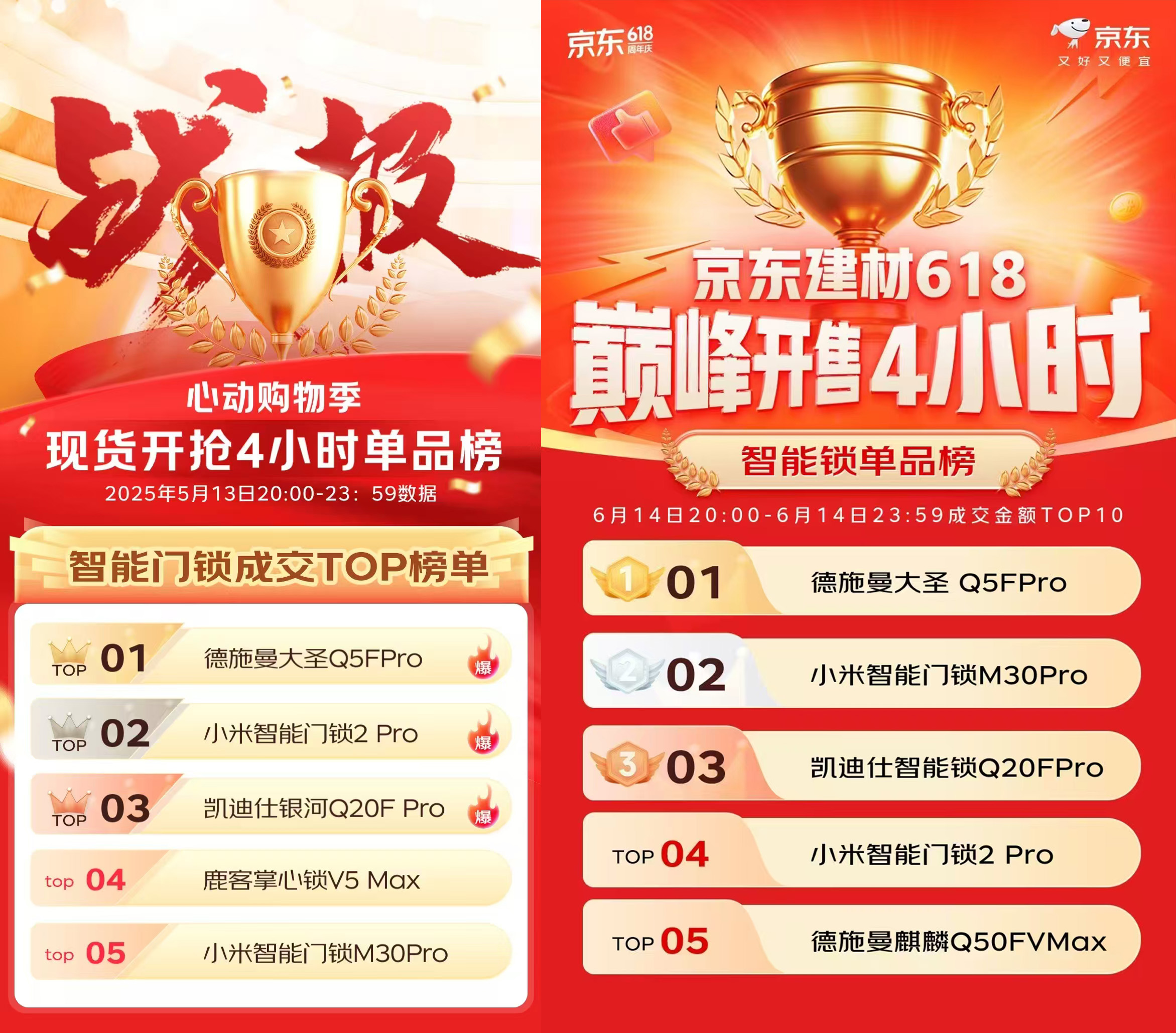 据悉,这已是德施曼连续第十年夺得618大促行业全平台销额&销量第一。在这场年中购物狂欢中,德施曼全线产品表现出色,其中明星单品大圣Q5FPro智能锁,更是横扫京东、天猫及抖音等电商官榜,销额全平台破亿,引发现象级抢购,成为这个618当之无愧的“国民大爆款”。