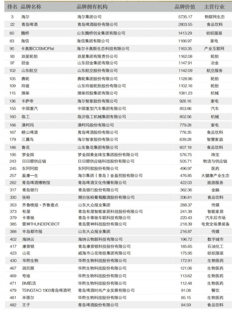 在山东的40个上榜品牌中,有22个来自青岛,占了一半之多,并呈现出集群化的特点。其中,海尔集团旗下有10个品牌入选,包含海尔、卡奥斯、卡萨帝、三翼鸟、日日顺供应链、盈康一生、有屋、卡泰驰、雷神以及海纳云;青啤有4个品牌上榜,包括青岛啤酒、崂山啤酒、TSINGTAO 1903以及王子;其他企业如海信、双星轮胎、赛轮等企业均有1个品牌上榜。上榜的青岛品牌展现了当地企业将工业基因与数字技术融合的实践,如海尔构建的“大企业共建、中小企业共享”生态、以及通过AI赋能智慧美好生活;青啤创新市场运营模式,加快新商业、新零售业务拓展。这些都为产业转型升级提供了新思路,产业基础雄厚、政策精准赋能、企业创新突围,三者协同发力让青岛品牌经济持续繁荣。