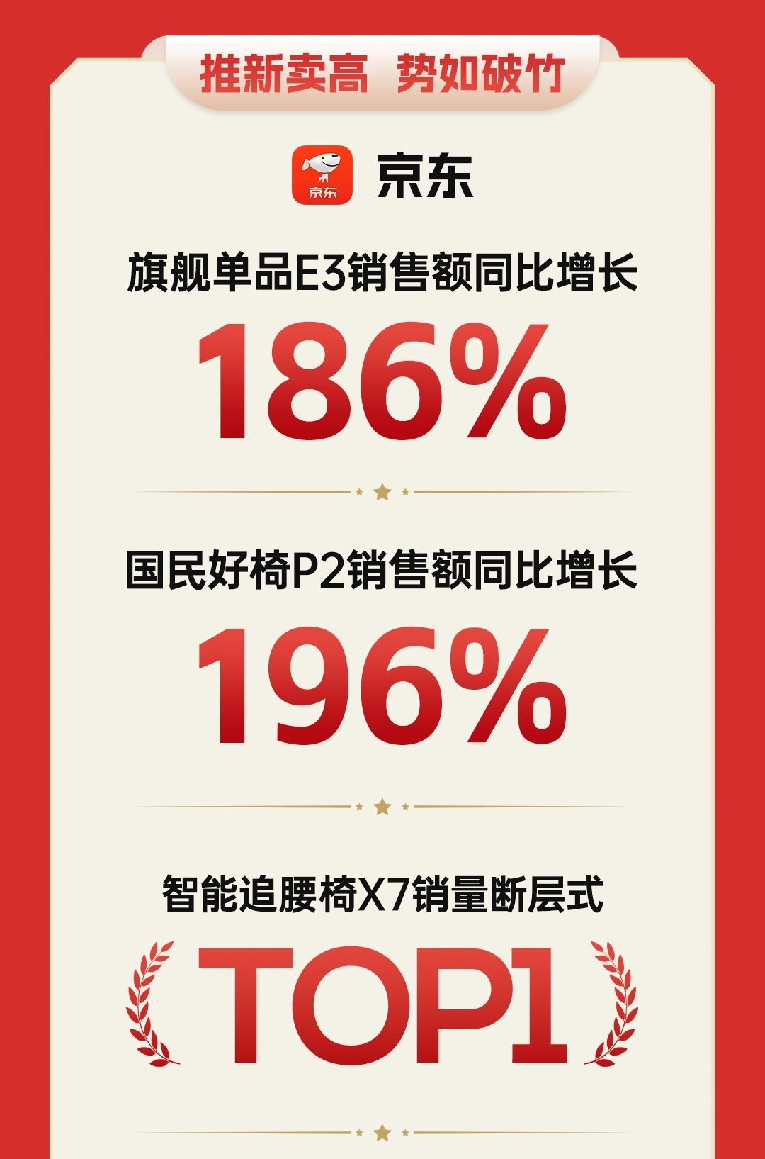 其中,黑白调京东渠道取得单品销售突出战绩:旗舰单品E3销售额同比增长186%,国民好椅P2销售额同比增长196%,智能追腰椅X7销量断层式TOP1,以智能人体工学技术开创行业新地位。