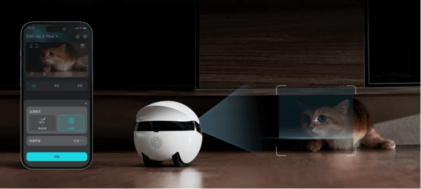 对于养宠家庭,EBO Air系列更是做了针对性的产品设计。小小的、圆滚滚的形态像一个“不倒翁”,即便被宠物推倒也能自己站起来,还可以在房间里自由来去,钻进床底、柜子缝寻找躲藏起来的毛孩子。此外,EBO的低姿态仰视广角拍摄,可以抓拍萌宠大脸照,自带的激光红点以及可拓展的羽毛配件,让你实现随时随地云撸猫。