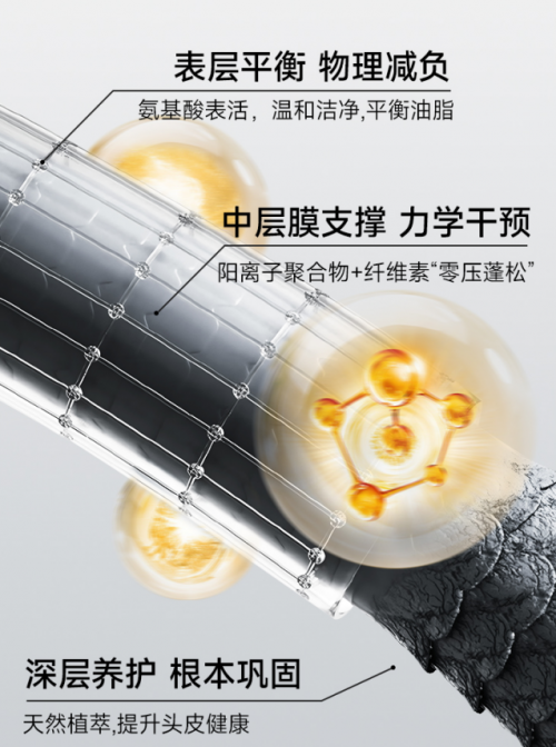 中层力学支撑构建“发丝隐形脚手架”:阳离子聚合物+纤维素形成网状支撑层,构建发丝支撑结构,通过力学干预实现"零压蓬松"。