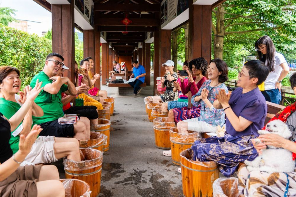 站在温汤古井旁,艾芙琳与来自上海、广州等地的“新温汤人”亲切交流。这群长期旅居的退休老人,每日在文化长廊泡脚、唱歌,享受富硒温泉带来的健康生活。来自上海的退休教师王美华已在温汤镇旅居3年。她说:“我患有轻度关节炎,来这里泡温泉半年后,疼痛明显缓解。现在每天和朋友们在长廊泡脚唱歌,生活惬意。”