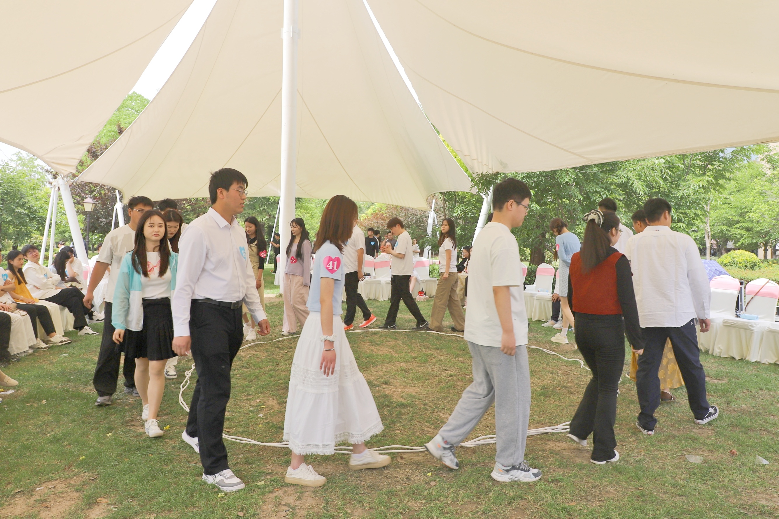 上午9点,男女青年齐聚天幕草坪,通过自我介绍快速破冰。在听歌识曲、桃花朵朵开、里里外外等趣味互动游戏中,大家踊跃参与、相互合作,展现自我、亲切交流,并主动交换联系方式,现场气氛轻松愉快。