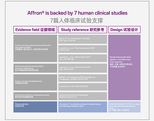 为了满足消费者对于复合营养的需求,CNS舒畅益生菌在情绪益生菌组合之外,还选取了西班牙affron藏红花提取物作为重要功能成分,共同辅助改善情绪状态。有7项临床试验表明,affron藏红花提取物无论对正常还是抑郁人群,均具有改善情绪、提高睡眠质量的作用。