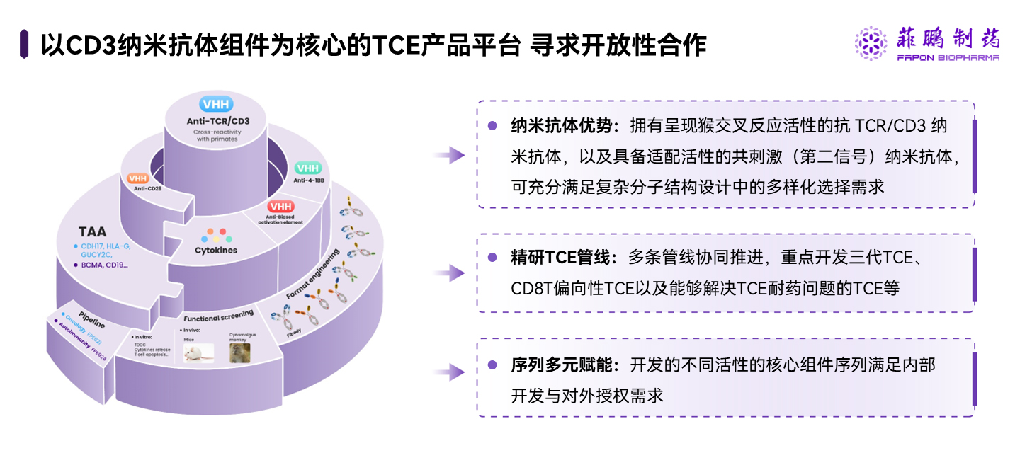 菲鹏制药针对行业痛点,打造了差异化的双/三抗TCE平台,不断升级CD3/TCR纳米抗体开发策略,针对CD3/TCR结构设计多样化的免疫、筛选方案。菲鹏制药开发的CD3/TCR纳米抗体具有人猴种属交叉结合活性,并且理化性能稳定,在未来多功能TCE分析构建中具有显著优势。由该纳米抗体组成的TCE分子安全性高,成药性优异,具有很大的竞争优势。基于菲鹏制药CD3/TCR纳米抗体,公司开发了同时靶向CD19和BCMA双靶标TCE治疗系统性红斑狼疮(SLE)、含第二信号的三抗TCE治疗实体瘤、偏向性CD8⁺T TCE治疗实体瘤等的TCE项目,在临床前实验中展现出优异性能,将为肿瘤及自身免疫性疾病治疗提供更好的解决方案。