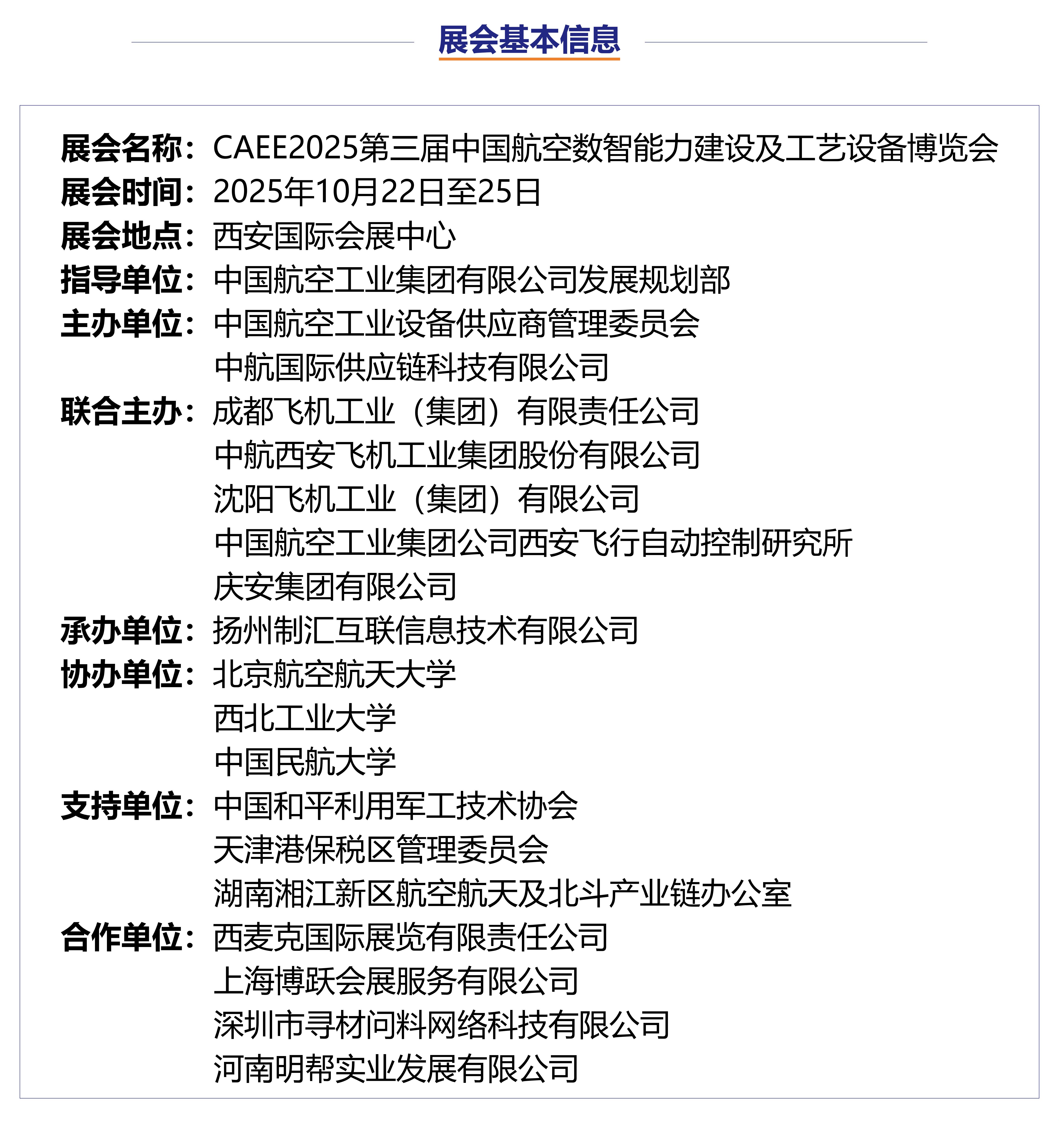 CAEE2025中国航空数智能力建设及工艺设备博览会—您的主舞台! 诚邀所有关注航空智能制造的伙伴,在参与本次高端对接会后,继续锁定CAEE2025—这一更全面展示航空数智化技术、先进工艺装备、产业链生态的国家级盛会。CAEE2025将是您发布新品、拓展网络、把握航空产业整体升级脉搏的核心主阵地!