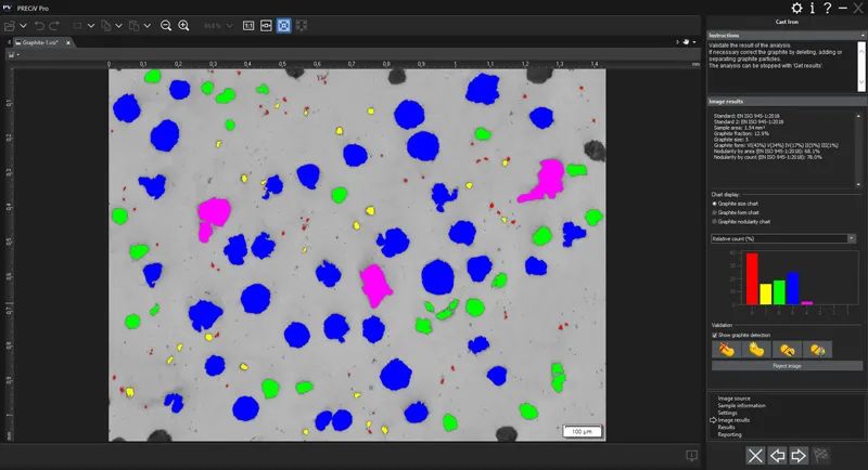 PRECiV 软件内置检测引擎,利用阈值方法可靠分离颗粒、划痕等目标,自动完成尺寸分布测量与计数。