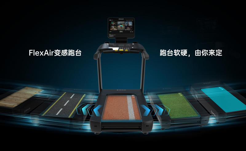 V10+ AI跑步大师一大亮点是搭载全新FlexAir变感跑台。该跑台采用气压动态跑感调控技,能够模拟橡胶跑道、柏油公路、绿草平地等5大跑感模式,用户可根据自己的喜好和运动需求,一键切换跑台软硬度,打破传统跑步单一体验的局限。