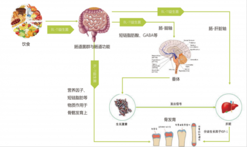 赛哺高的研究显示,BL-11益生菌通过调节肠道菌群,经营养代谢、免疫、内分泌三条途径作用于长高。从营养代谢角度来看,它能够调整肠道内的微生物平衡,增强钙质和维生素D等重要营养素的吸收和调用;从内分泌途径来看,通过肠脑轴,它能使脑垂体产生内源性生长激素,进而刺激肝脏合成IGF-1,从而刺激骨骼生长;另外,赛哺高BL-11益生菌它还从免疫途径,通过肠骨轴,改善骨骼炎症状态,调节成骨和破骨细胞的平衡,促进成骨细胞活性,抑制破骨细胞活性,从而有利于骨骼的生长。天津中医药大学研究员吴崇明博士领衔联合多家医院,先后进行了一系列多个批次的临床研究,针对不同人群和服用时长,评估赛哺高BL-11对促进儿童身高增长的效果,结论是:
