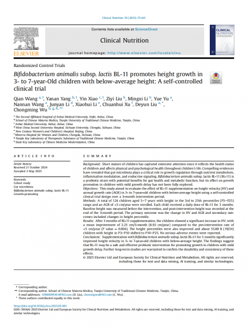 中国预防医学会儿保分会生长发育与营养学组组长,中国妇幼保健协会儿童早期发展专委会副主任委员吴康敏教授对外分享的动物双歧杆菌乳亚种BL-11干预身材矮小儿童身高的临床数据显示:在服用BL-11益生菌油滴液干预身高3个月后,84%以上的儿童身高增长明显,总体平均身高增长将近2.5厘米左右,年化增长率超过平均年化增长率50%左右。近期,赛哺高专利菌株BL-11益生菌的新临床研究成果正式发表于国际期刊《Clinical Nutrition》(《临床营养学》)。该研究证实BL-11益生菌在促进儿童生长发育方面,具有显著效果,这是赛哺高在儿童成长领域取得的又一突破性进展。